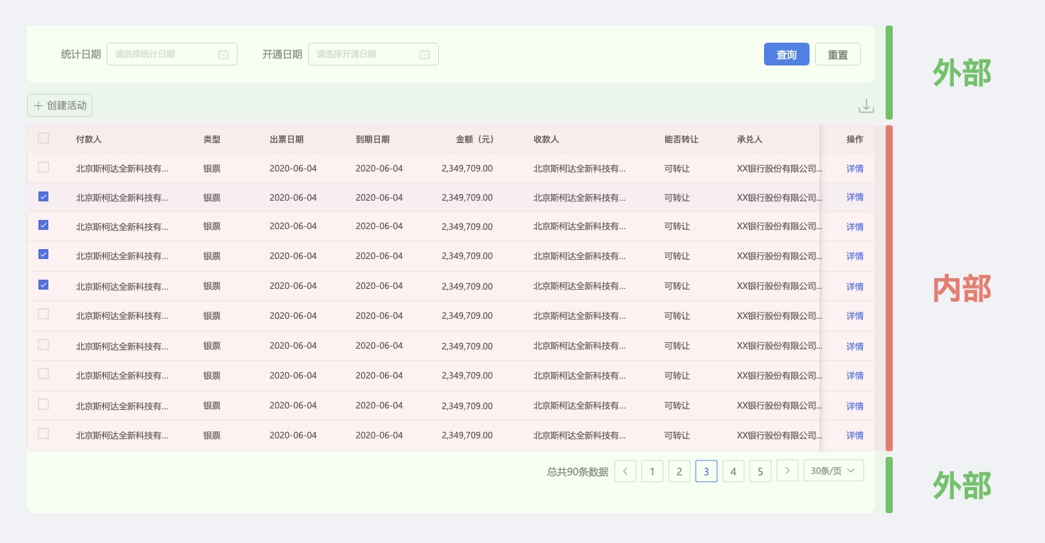 外部:由篩選區(qū)域、操作按鈕區(qū)、分頁區(qū)共3大類組成。